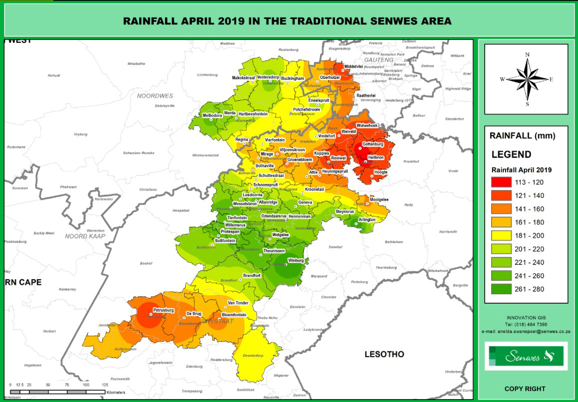 In die tyd was die gemiddelde reënval in ons gebied ‘n massiewe 188.7 mm. Dit is die meeste reëval in April in ‘n 104 jaar sedert die 1915/16 seisoen. Senior Graananalis by Senwes, Thys Grobbelaar het by navraag ook genoem dat dit die ou rekord verpletter het. Die vorige hoogste gemiddelde reënval was 117 mm tydens die 1942/43 seisoen. Om dit in perspektief te plaas is die langtermyn gemiddelde reënval vir April in die Senwesgebied maar 40.5 mm. Met ander woorde dit is meer as vier en ‘n half keer die langtermyn gemiddeld.