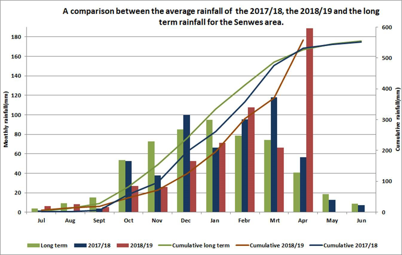 Uit die statistiek het dit ook geblyk dat ons vanjaar 333.3% meer reën in April 2019 ontvang het as in die ooreenstemmende tydperk in April 2018, en dan was die kumulatiewe reënval vir die seisoen tot dusver 106.1% van die 33-jaar gemiddeld.