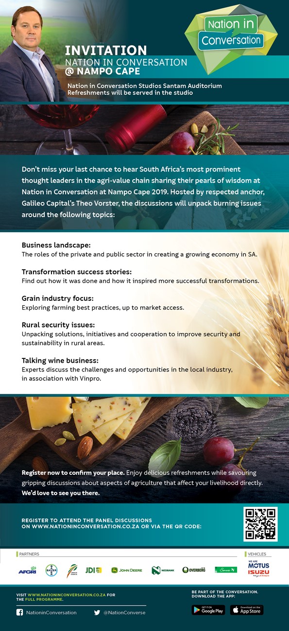 Nation in Conversation is proudly brought to you by our partners - AFGRI, Bayer, JDI, John Deere, Nedbank, Overberg Agri, Senwes, Grain SA and Motus Isuzu.